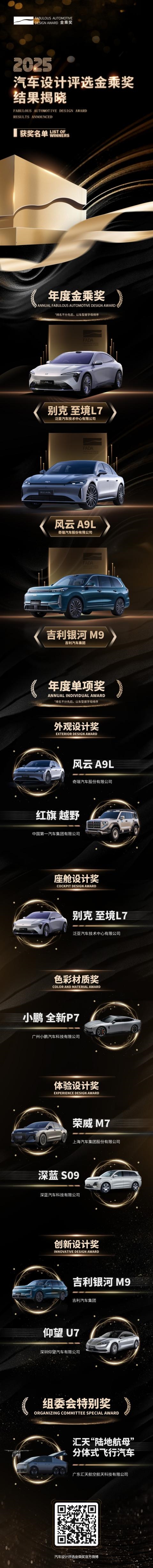 在“2025汽车设计评选金乘奖”奖项中,以下车型凭借卓越表现斩获“年度金乘奖”(排名不分先后,按车型拼音首字母排序):别克 至境L7、风云 A9L、吉利银河 M9