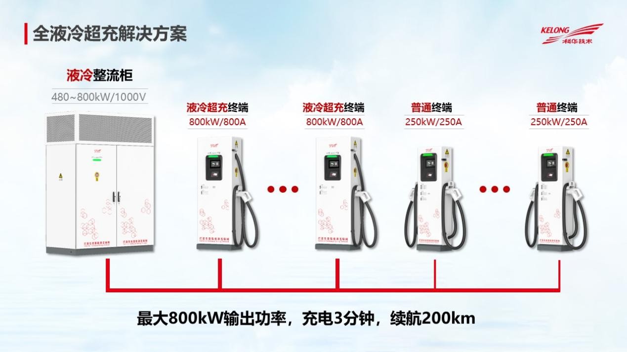 目前,行业内大多风冷大功率充电堆特点如下:70~80db的噪音、95%的峰值效率、IP54防护等级、5~8年的寿命。科华基于大功率充电行业现状及未来发展趋势,推出全液冷超充解决方案,支持800kW超大功率和1000V电压输出,最多可配置6个超充终端、6个普通终端或二者自由组合。在电池能够支持的情况下,该方案可助力车辆“充电3分钟,续航200km”。