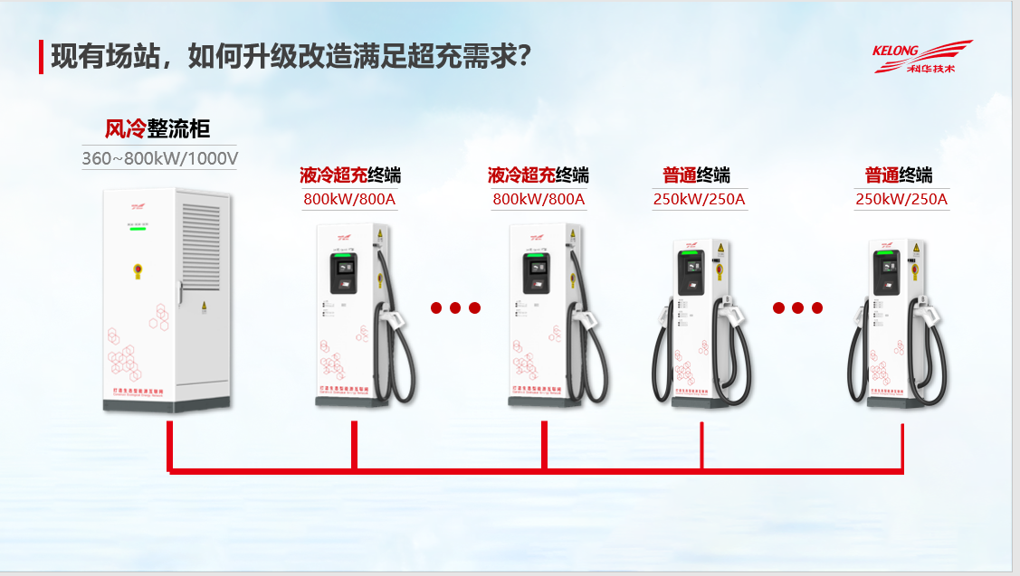 科华同时拥有其他大功率充电解决方案,方案支持360~800kW功率输出,可灵活配置液冷终端与普通终端。基于部分用户想对现有场站进行超充升级,科华方案最大支持现场改造6个超充终端,可实现单模块投切,最大支持800A电流输出,以满足超充需求。