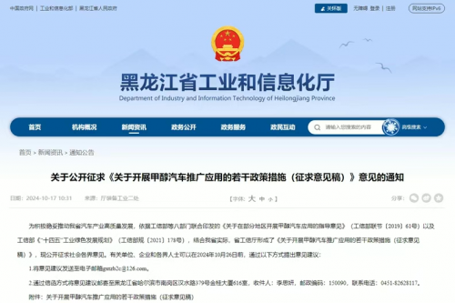 黑龙江省工信厅10月发布了《关于开展甲醇汽车推广应用的若干政策措施(征求意见稿)》,积极探索适合低温寒冷地区清洁能源汽车推广应用有效路径,加快培育壮大北方寒区汽车生产基地,积极稳妥推动汽车产业高质量发展。