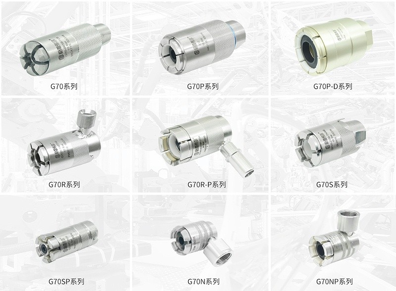 采用侧面流体接口并集成安全锁结构,增强操作安全性,适合侧面连接不受限的场合。标准型号不多,以定制为主。